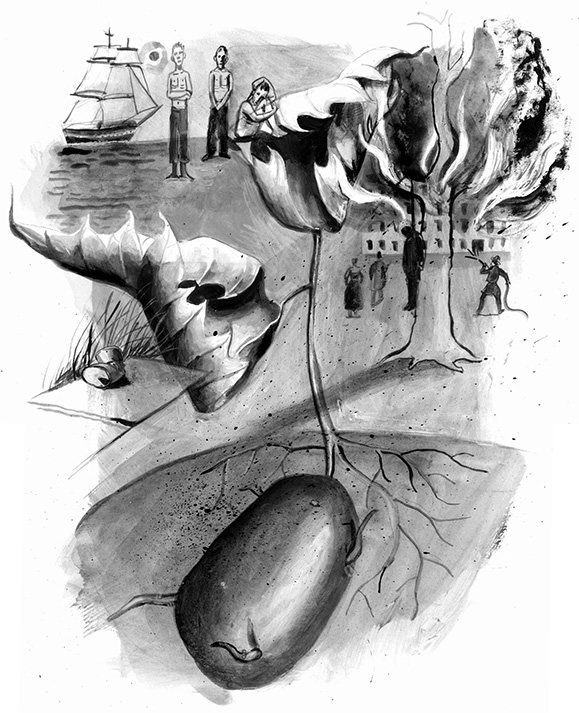 At first, it seemed to be nothing. It was a curled-up dark brown leaf about the size of a good lock of hair and it was preserved in glass in a room in the Fairlow Herbarium in Cambridge, Massachusetts. A typewritten card alongside the leaf said that it was taken from an infected potato plant in Ireland during the famines of 1845-50. I looked at the leaf, read the card, and began to walk away and, of course, did not leave. Here in this glass case was the weapon used by the earth when it turned against man and nearly ended a nation, the leaf that determined the character of its people, wherever they were, for generations at least.
