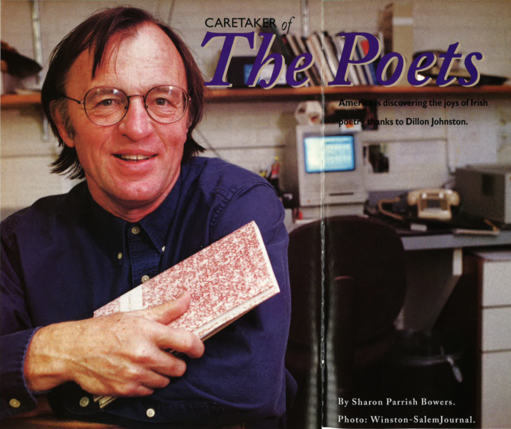 He credits Liam Miller, who ran Dolmen Press, Ireland’s only poetry press at that time, with being “terribly encouraging,” as well as Edwin G. Wilson, former provost of Wake, who enthusiastically accepted Johnston’s initial proposal to establish the Press. And Johnston is characteristically modest about his own part in the process, which included nosing out young and unknown Irish poets.