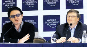 Bono speaks at the World Economic Forum while Bill Gates (right) ‘listens’, New York, Feb. 2002. July 11, 2019 by Leave a Comment
