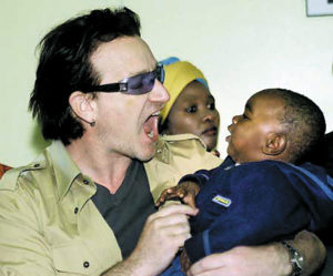 Bono with an 11 month old HIV-positive baby that he met when visiting on AIDS clinic as part of his tour of Africa with US Treasury Secretary Paul O’Neill, May, 2002. July 11, 2019 by Leave a Comment