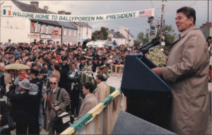 The facade of that building was later transported to The Ronald Reagan Presidential Library in California, where it still stands. “Of all the honors and gifts that have been afforded me as President, this visit is the one that I will cherish dearly,” Reagan told the crowd in Ballyporeen. “I didn’t know much about my family background – not because of a lack of interest, but because my father was orphaned before he was six years old. And now thanks to you and the efforts of good people who have dug into the history of a poor immigrant family, I know at last whence I came. And this has given my soul a new contentment. And it is a joyous feeling. It is like coming home after a long journey.”