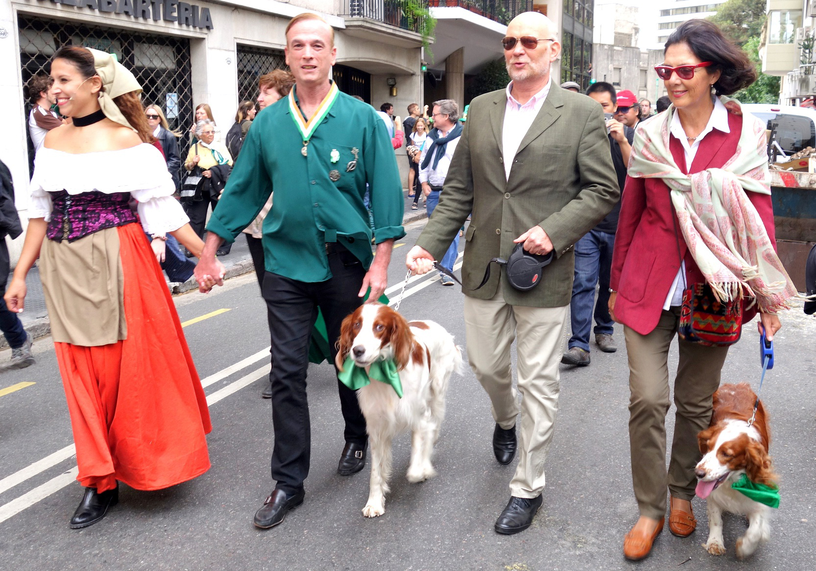 Marching in the Buenos Aires St. Patrick’s Day Parade (left to right): Valeria Ruggiero, Jorge Mackey, Irish Ambassador to Argentina Justin Harman, and his wife, Carmen Casey.
