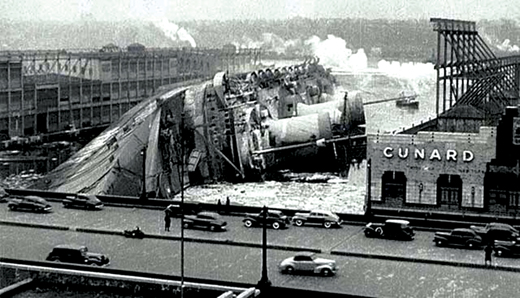 The SS Normandie lies on its side on the Hudson River after a fire aboard the ship. March 22, 2019 by Leave a Comment