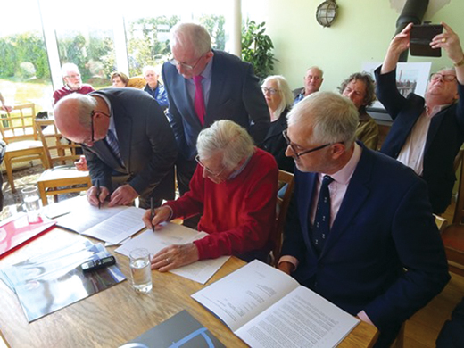 Gifting the Lusitania: Pictured (left to right) Old Head of Kinsale Museum chairman J.J. Hayes; secretary Con Hayes; Gregg Bemis, owner of the Lusitania; and Richard Martin, solicitor, at the signing ceremony.