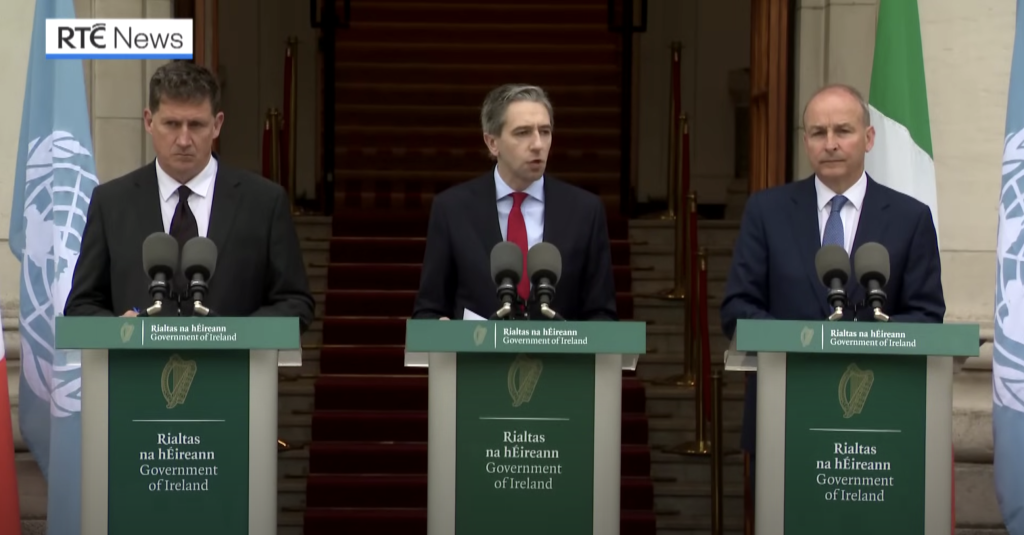 Three leaders of the coalition government – Taoiseach Simon Harris, Tánaiste Micheál Martin and Green Party Minister Eamon Ryan – held a press conference at Government buildings in Dublin on Wednesday morning May 22, to make the announcement (watch here on RTE).