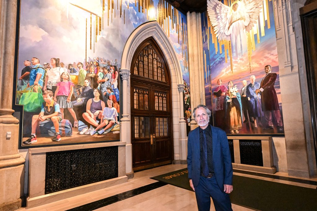 The new work, “What’s So Funny About Peace, Love, and Understanding,” transforms all three walls inside the landmark church’s Fifth Avenue entrance vestibule into a sweeping vision of faith, history, and service. The mural, the cathedral’s biggest permanent artwork in 146 years, is expected to be viewed by as many as six million visitors who tour the Cathedral each year.