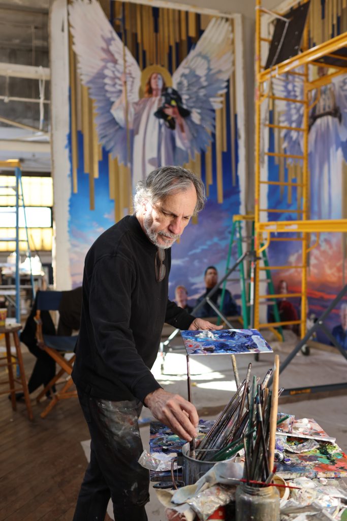 His major public commissions span the country: “10,000 Feet,” a sweeping mural of the Indiana countryside for Indianapolis’s Alexander Hotel; a four-panel oil painting for Atlanta’s Mercedes-Benz Stadium; and an ambitious project for the Birch Bayh Federal Building and United States Courthouse in Indianapolis featuring 164 individual murals totaling more than 7,000 square feet, chronicling American battlefields from the colonial period to the present. For the Saint Patrick’s Cathedral commission, he was one of six major artists invited to submit a proposal. His vision prevailed, and two years later, his completed work was unveiled to the public.