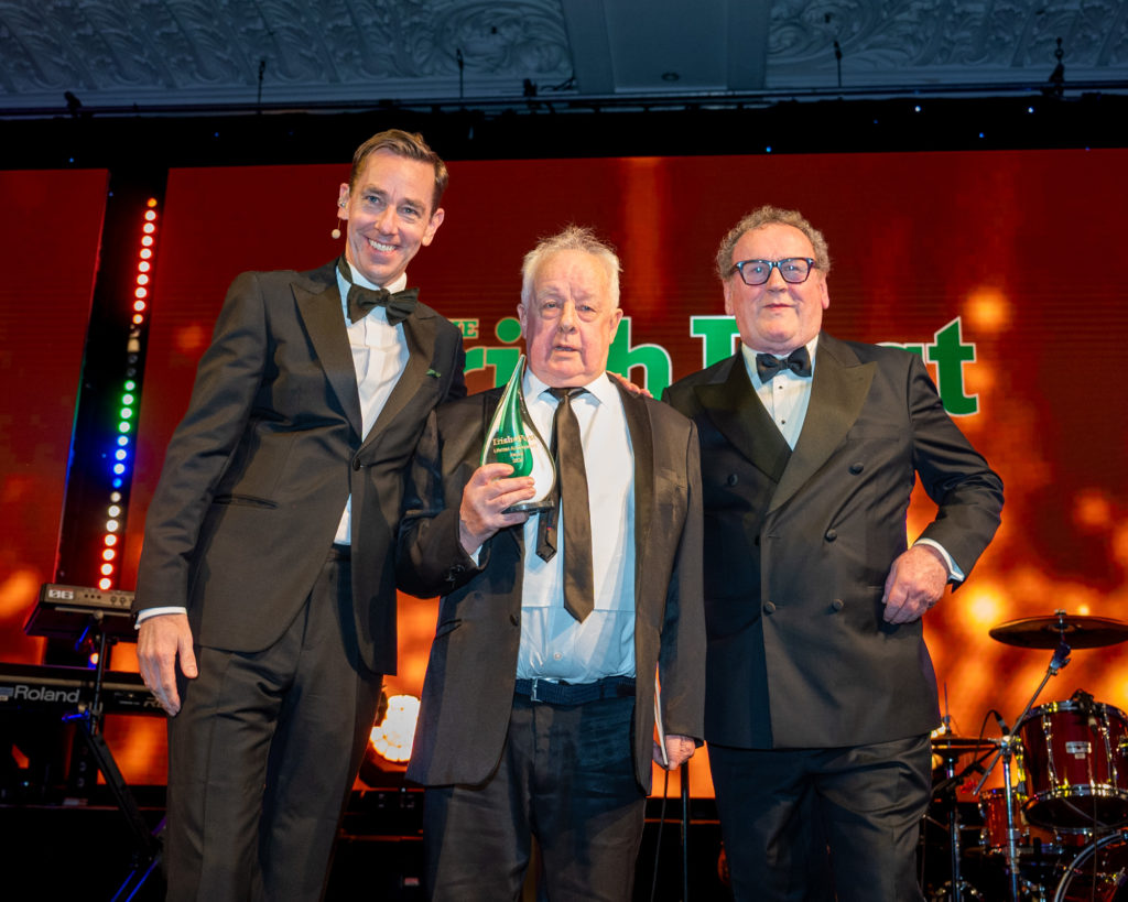 Film director Jim Sheridan won the Lifetime Achievement Award at The Irish Post Awards 2025. Pictured: Presenter Ryan Tubridy, Jim Sheridan, and actor Colm Meaney.