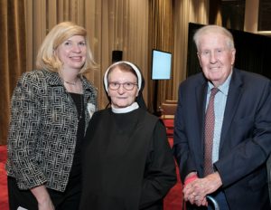 TOP RIGHT: THE EMERALD GUILD SOCIETY: L to R: Sean Blake (Emerald Guild Society Scholarship Chairman), Paul Motherway (Vice President, Emerald Guild Society), and Michael Gubbins (Emerald Guild Trustee). CENTER: KYLEMORE ABBEY: Rosalind Secker-Walker, John Normile, and Jamey Murphy. RIGHT: KYLEMORE ABBEY: L. R. Hon. Kelly O’Neill Levy, Sr. Magdalena FitzGibbon OSB (Kylemore Abbey), John Feerick (Fordham Law School)